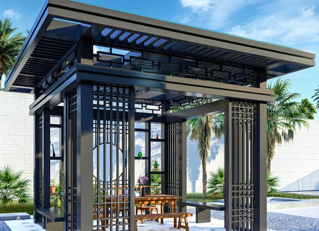 1、新中式鋁合金涼亭安裝簡單,施工便捷,不需要繁雜的施工工藝,節(jié)省安裝時間和費用。
