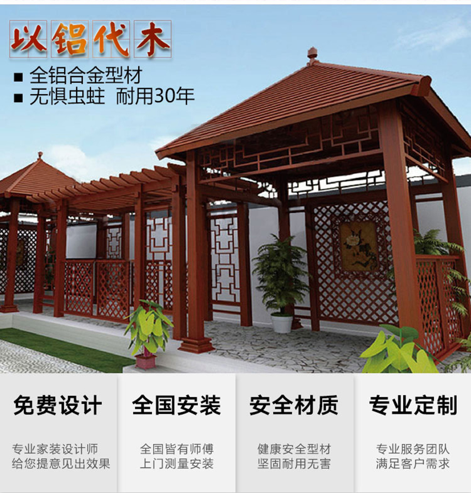 涼亭長廊系列是演繹自然與生活的交融,創(chuàng)新的鋁合金框架加以表面木紋處理完美承襲生活所追求自然的經(jīng)典魅力,而它的設計靈魂正是根源于當下所倡導的自然環(huán)保。此外,采用完美的建筑材料——水印氟碳木紋鋁型材,可在視覺上營造出與自然對稱和諧之美,并具有耐候性、耐磨損、耐腐蝕性,硬度高、不易變形、仿木真圖案不褪色、不脫落等優(yōu)越特點,呈現(xiàn)出自然與環(huán)保的平衡布局,成為經(jīng)久不衰的典雅風格化身。