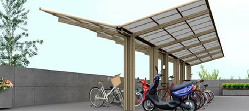 自行車停車棚頂棚采用進(jìn)口聚碳酸酯板,抗沖擊是玻璃的數(shù)百倍,有效防止高空墜物