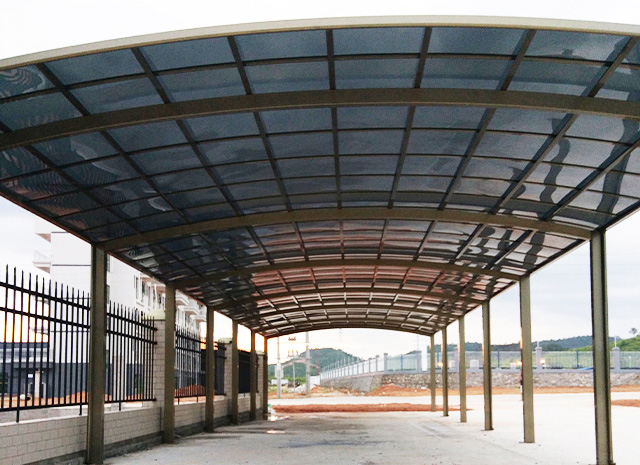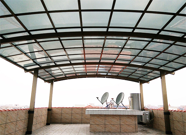 頂棚采用進(jìn)口聚碳酸酯板,抗沖擊是玻璃的數(shù)百倍,有效防止高空墜物